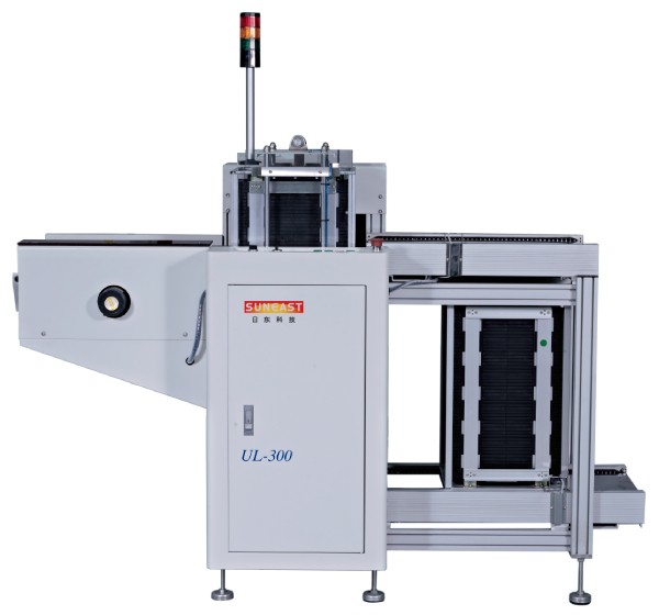 全自動PCB上料機介紹:特殊升降臺穩固結構,升降不搖晃,順利的將PCB推出;PLC程序控制,性能穩定,確保生產線暢通平順;