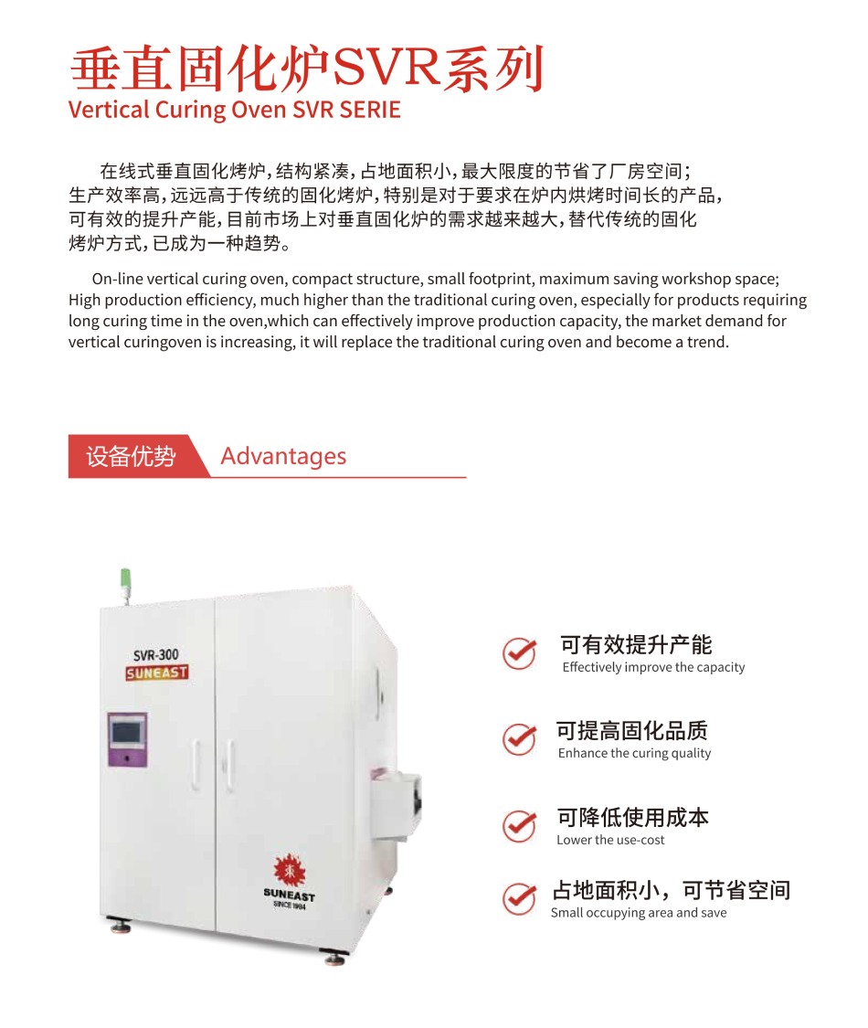 在線式垂直回流烤爐,結構緊湊,占地面積小,最大限度的節省了廠房空間;生產效率高,遠遠高于傳統的固化烤爐,特別是對于要求在爐內烘烤時間長的產品,可有效的提升產能。