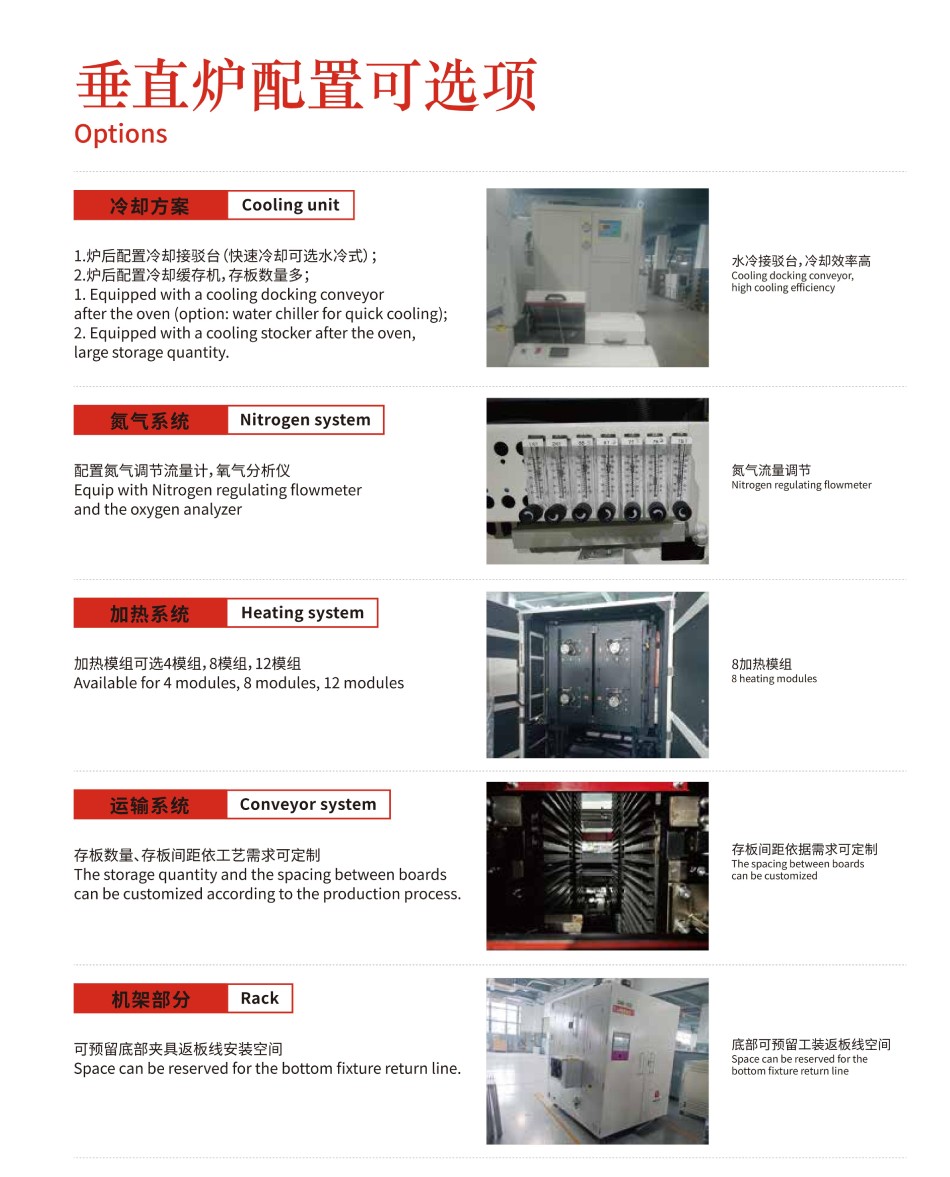 在線式垂直回流烤爐,結構緊湊,占地面積小,最大限度的節省了廠房空間;生產效率高,遠遠高于傳統的固化烤爐,特別是對于要求在爐內烘烤時間長的產品,可有效的提升產能,目前市場上對垂直回流爐的需求越來越大,替代傳統的固化烤爐方式,已成為一種趨勢。