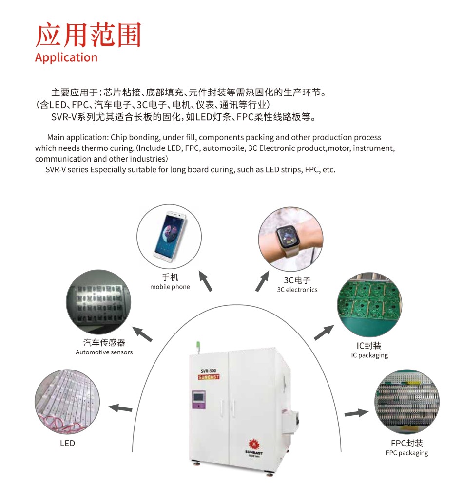主要應用于:芯片粘接、底部填充、元件封裝等需熱固化的生產環節。(含汽車電子、電機、儀表、通訊等行業)