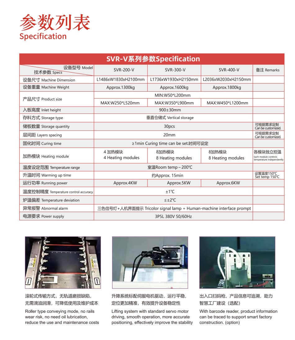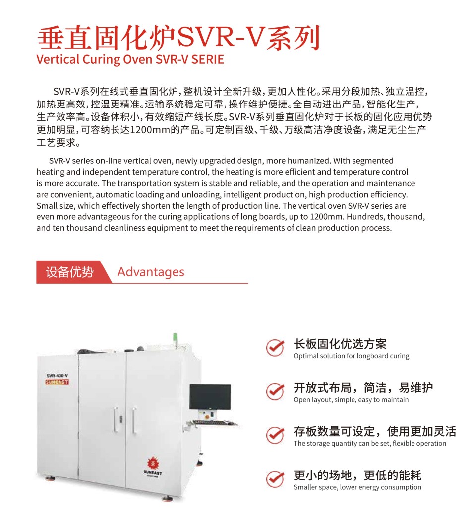 SVR-V系列在線式垂直固化爐,整機設計全新升級,更加人性化。采用分段加熱、獨立溫控,加熱更高效,控溫更精準。運輸系統(tǒng)穩(wěn)定可靠,操作維護便捷。全自動進出產(chǎn)品,智能化生產(chǎn),生產(chǎn)效率高。設備體積小,有效縮短產(chǎn)線長度。SVR-V系列垂直固化爐對于長板的固化應用優(yōu)勢更加明顯,可容納長達1200mm的產(chǎn)品??啥ㄖ瓢偌?、千級、萬級高潔凈度設備,滿足無塵生產(chǎn)工藝要求。