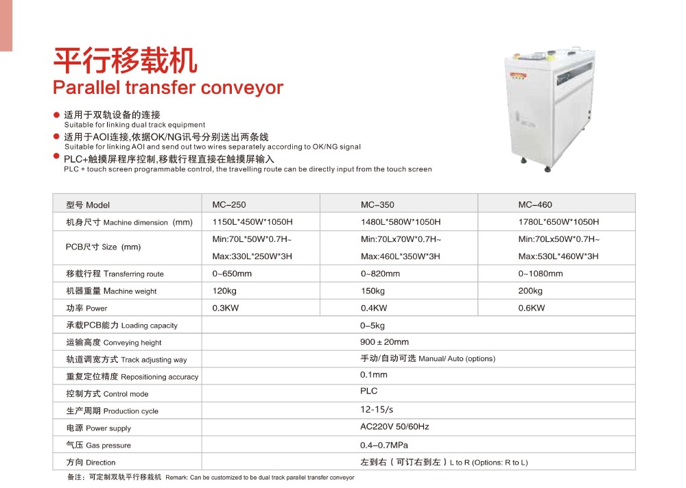 smt平行移載機(jī)介紹:適用于雙軌設(shè)備的連接;適用于AOI連接,依據(jù)OK/NG訊號(hào)分別送出兩條線(xiàn);PLC+觸摸屏程序控制,移載行程直接在觸摸屏輸入。