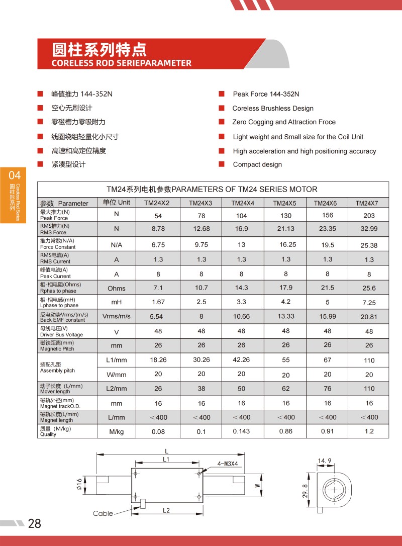 | TM 24系列圓柱形直線電機參數(shù)PARAMETERS OF TM 24 SERIES MOTOR | |||||||