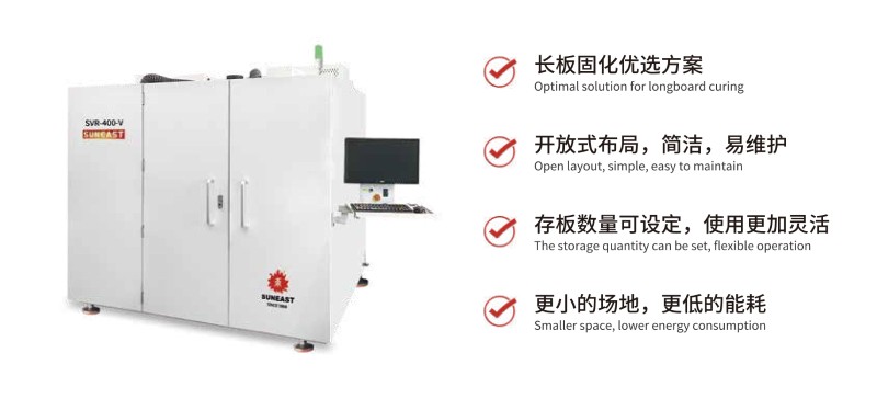 SVR-V系列在線式垂直固化爐,整機(jī)設(shè)計(jì)全新升級(jí),更加人性化。采用分段加熱、獨(dú)立溫控,加熱更高效,控溫更精準(zhǔn)。運(yùn)輸系統(tǒng)穩(wěn)定可靠,操作維護(hù)便捷。全自動(dòng)進(jìn)出產(chǎn)品,智能化生產(chǎn),生產(chǎn)效率高。設(shè)備體積小,有效縮短產(chǎn)線長(zhǎng)度。SVR-V系列垂直固化爐對(duì)于長(zhǎng)板的固化應(yīng)用優(yōu)勢(shì)更加明顯,可容納長(zhǎng)達(dá)1200mm的產(chǎn)品??啥ㄖ瓢偌?jí)、千級(jí)、萬(wàn)級(jí)高潔凈度設(shè)備,滿(mǎn)足無(wú)塵生產(chǎn)工藝要求。
