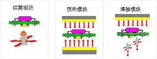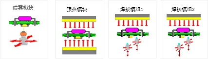 預(yù)熱模塊由底部預(yù)熱、頂部預(yù)熱、焊接保溫模塊組成。各溫區(qū)獨(dú)立循環(huán)、獨(dú)立控溫。可根據(jù)產(chǎn)品尺寸,自動(dòng)關(guān)閉產(chǎn)品尺寸范圍外的加熱,節(jié)能簡(jiǎn)單。