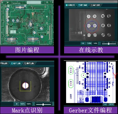 支持CAD、Gerber、坐標(biāo)文檔、圖片文檔多種方式進(jìn)行編程,標(biāo)配示教相機(jī),可在線視覺(jué)編程。支持離線編程。每個(gè)焊點(diǎn)參數(shù)都可獨(dú)立設(shè)置。全程可視化操作,在線調(diào)試方便快捷。自動(dòng)優(yōu)化焊接順序,節(jié)省焊接時(shí)間。可提供MES系統(tǒng)接口。