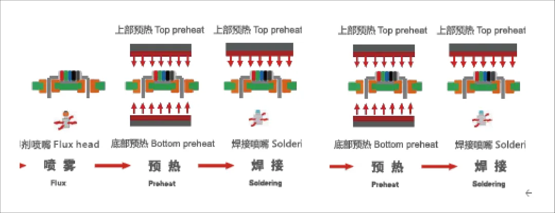 ② 噴霧+預(yù)熱+焊接+預(yù)熱+焊接