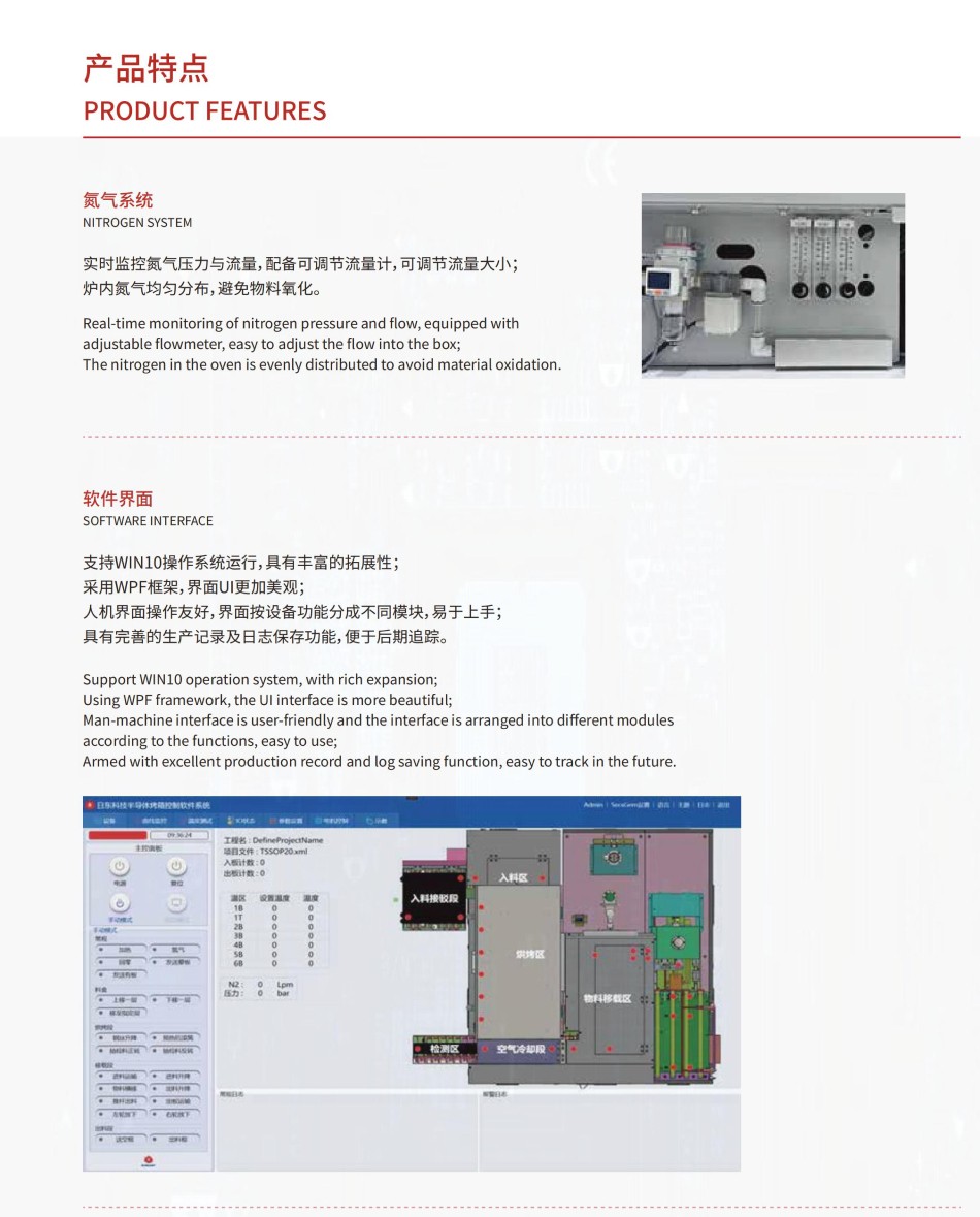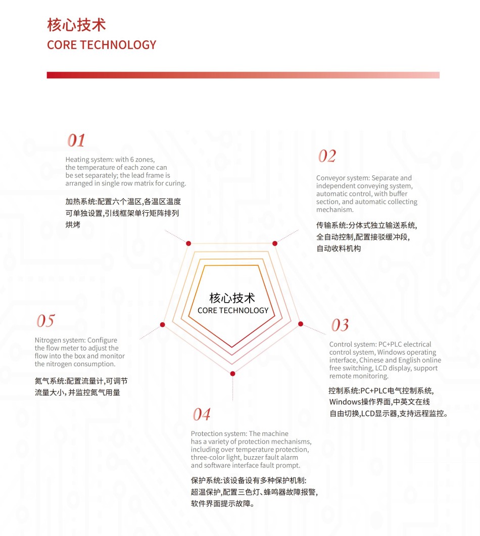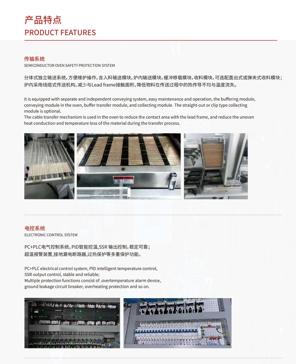 加熱系統(tǒng):配置六個溫區(qū),各溫區(qū)溫度可單獨設置,引線框架單行矩陣排列烘烤。