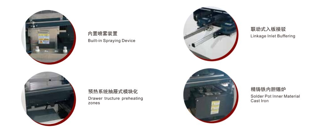 ●錫爐采用外熱式加熱,錫爐內(nèi)膽采用鑄鐵制作,內(nèi)表面防腐蝕處理,兩個(gè)低流速噴口、低氧化量設(shè)計(jì);